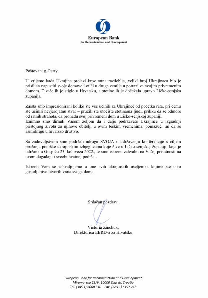 Direktorica Europske banke za obnovu i razvoj, Victoria Zinchuk zahvalila županu Petryju na pomoći Ukrajincima. Njeno pismo prenosimo u nastavku: