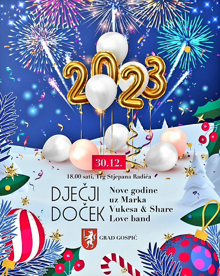 30.prosinca 2022.godine od 18 sati na Trgu Stjepana Radića najmlađe Gospićane zabavljat će MARKO VUKES & Share love band, VILENJAK BALONKO i MAĐIONIČAR!