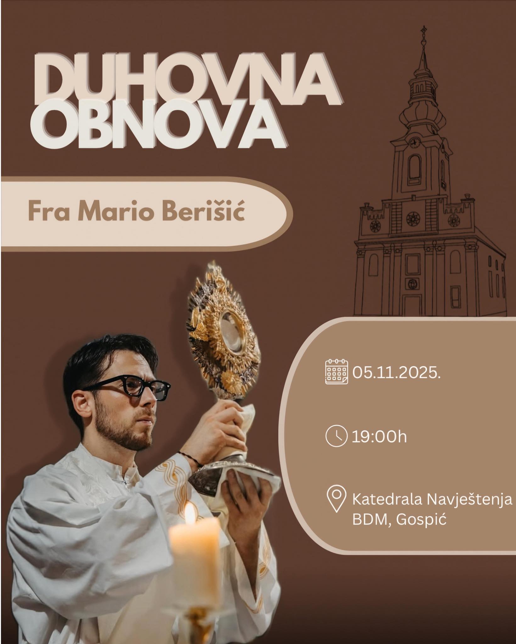 U srijedu 5. studenoga 2025. u 19 sati, u gospićkoj Katedrali Navještenja Blažene Djevice Marije, održat će se duhovna obnova koju predvodi fra Mario Berišić, franjevac kapucin i svećenik poznat po svom radu s mladima, svjedočanstvu vjere i blizini s narodom.