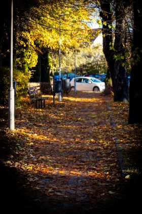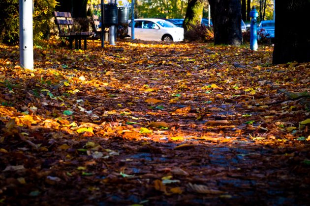 Nisko sunce probija se kroz krošnje i izdvaja pruge topline po tlu, naglašavajući kontrast mokrog asfalta i suhog lišća. U krupnom planu mahovina i sporofiti stvaraju gotovo apstraktne prizore, a makro detalji podsjećaju da se jesen ne čita samo u panoramama nego i u sitnicama koje često prođemo bez pogleda.
