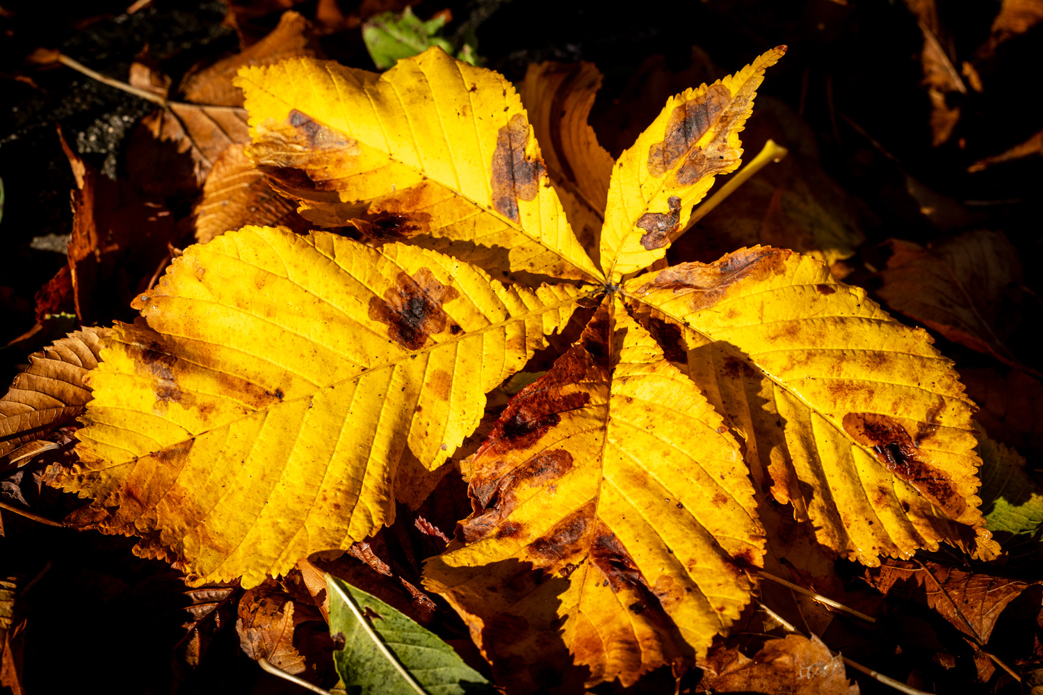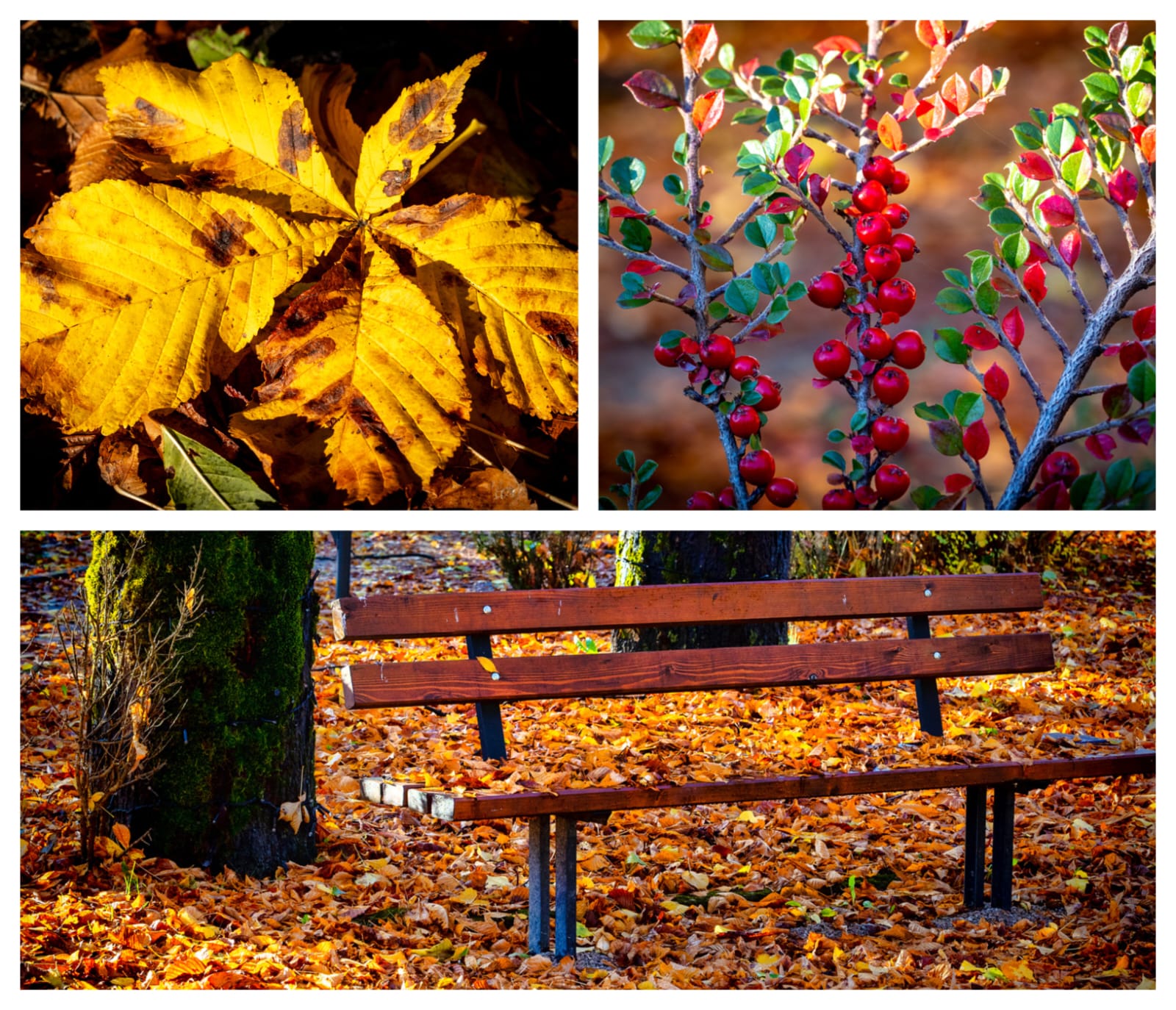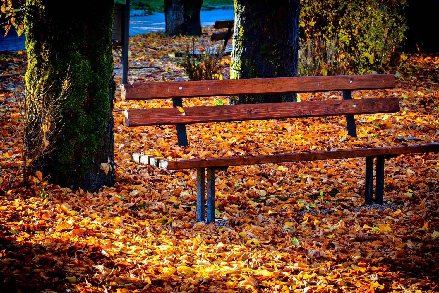 Nisko sunce probija se kroz krošnje i izdvaja pruge topline po tlu, naglašavajući kontrast mokrog asfalta i suhog lišća. U krupnom planu mahovina i sporofiti stvaraju gotovo apstraktne prizore, a makro detalji podsjećaju da se jesen ne čita samo u panoramama nego i u sitnicama koje često prođemo bez pogleda.