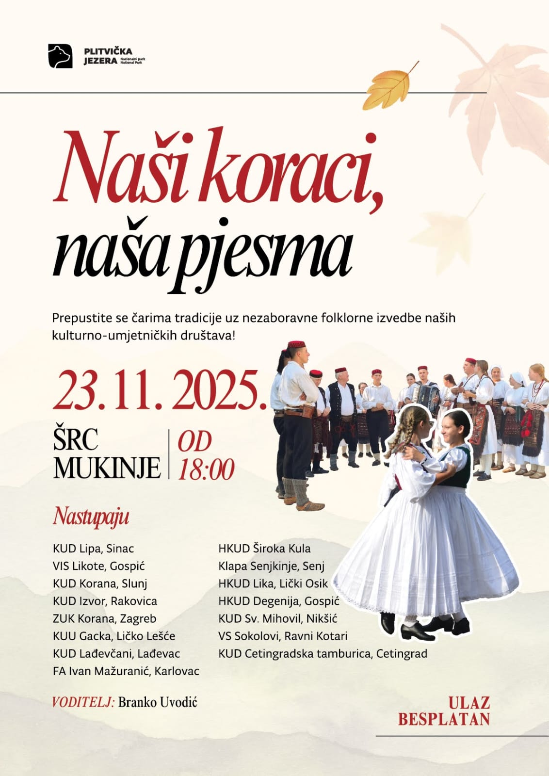 Nacionalni park Plitvička jezera najavio je održavanje manifestacije „Naši koraci, naša pjesma“, koja će se upriličiti u nedjelju, 23. studenoga 2025. godine, s početkom u 18 sati u Športsko-rekreacijskom centru Mukinje. Ulaz na događaj je besplatan, a večer će voditi dugogodišnji televizijski voditelj Branko Uvodić.