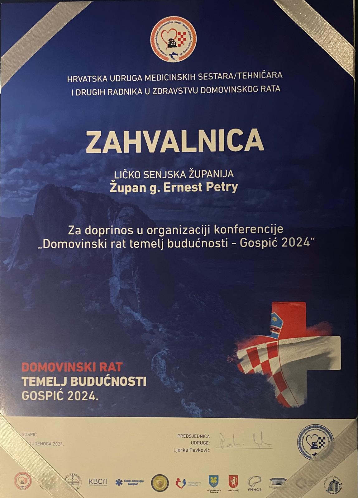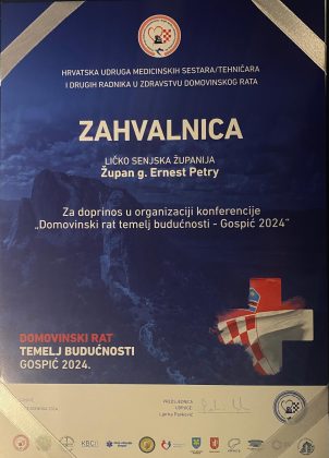 U sklopu svečane konferencije dodijeljene su i Zahvalnice dionicima među kojima je Zahvalnicu preuzeo i župan Ličko-senjske županije Ernest Petry za doprinos u organizaciji konferencije „Domovinski rat temelj budućnosti“- Gospić 2024.
